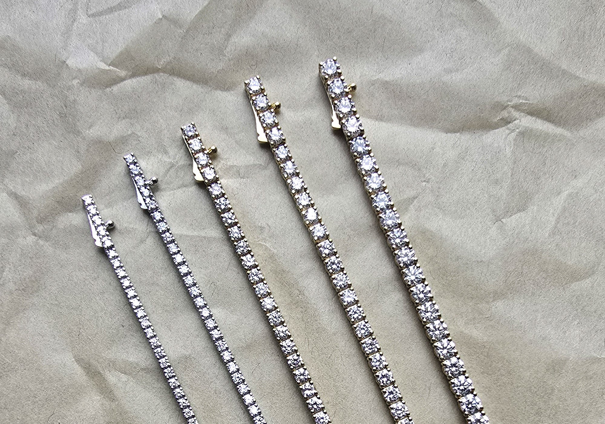 The individual stones range in size from 1.45 mm and up to your prefer size, each precisely calibrated to maintain perfect rhythm across the bracelet’s line. Every setting is hand-polished to let the diamonds catch light evenly — clear, balanced, and enduring.